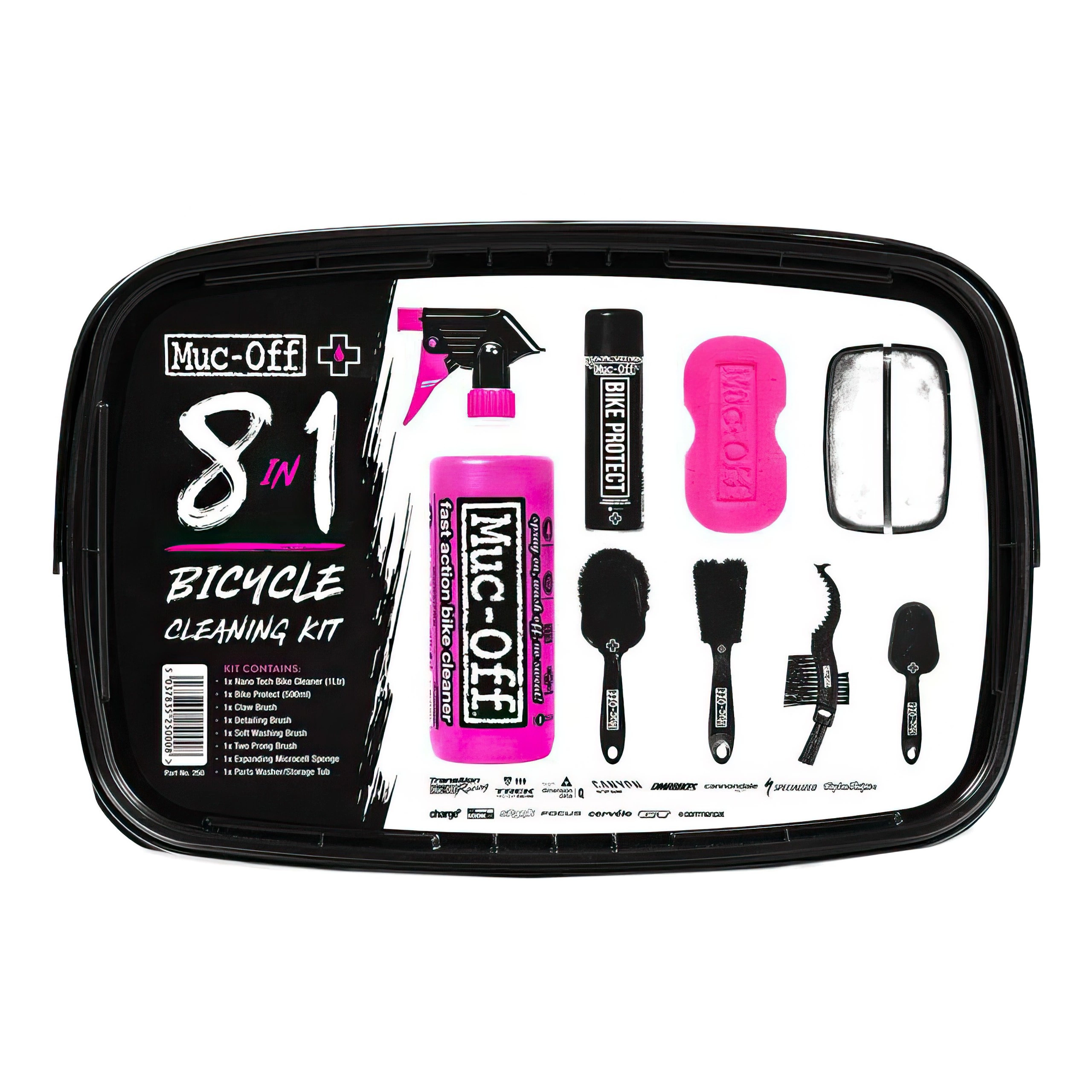 I sættet finder du nano tech cykelrens, ekspanderende mikrocellesvamp, blød vaskebørste, detaljebørste, kløbørste, todelt børste, cykelspray og opbevaringsbalje.