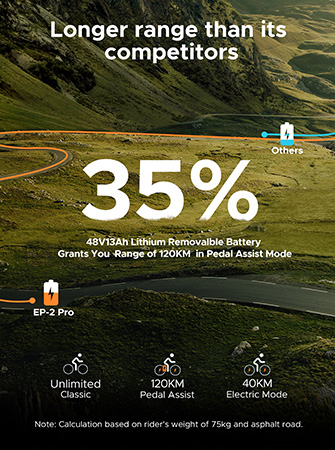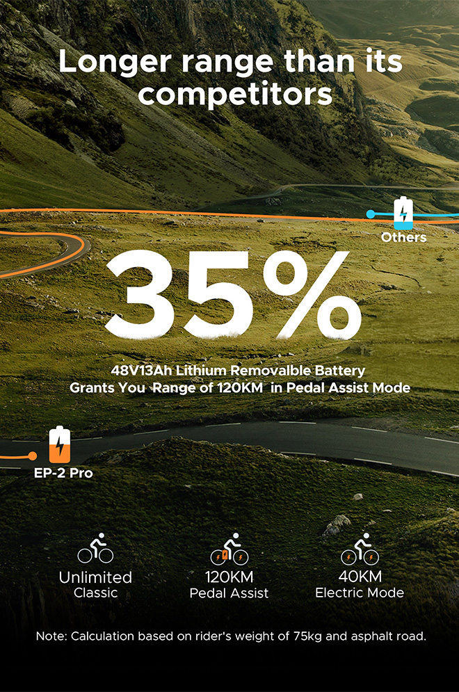 ENGWE EP-2 PRO er udstyret med et 48V 13Ah litiumbatteri og har en rækkevidde på op til 120 km på en enkelt opladning i power assist-tilstand. Batteriet er aftageligt. Du kan nemt oplade det derhjemme, i garagen eller på kontoret.