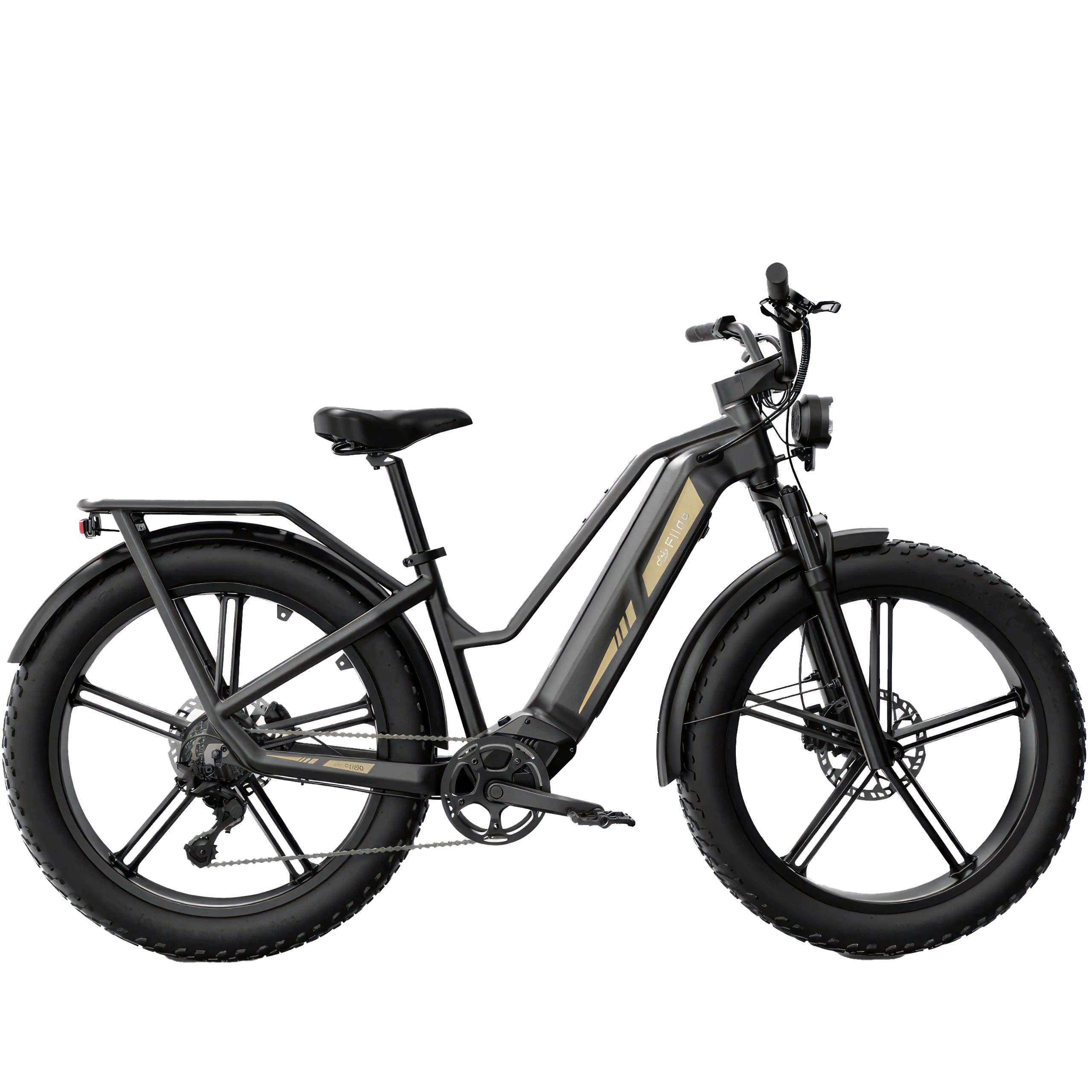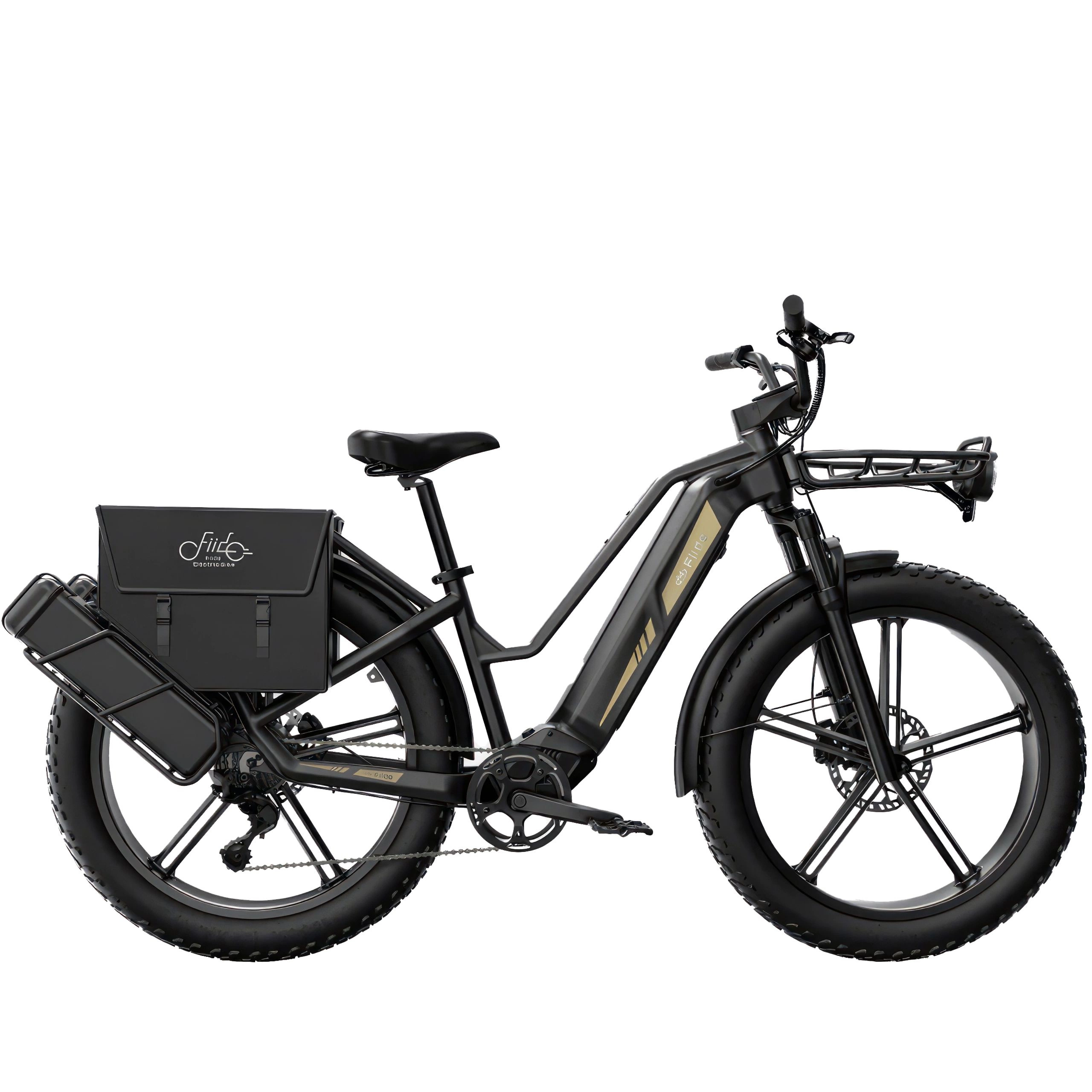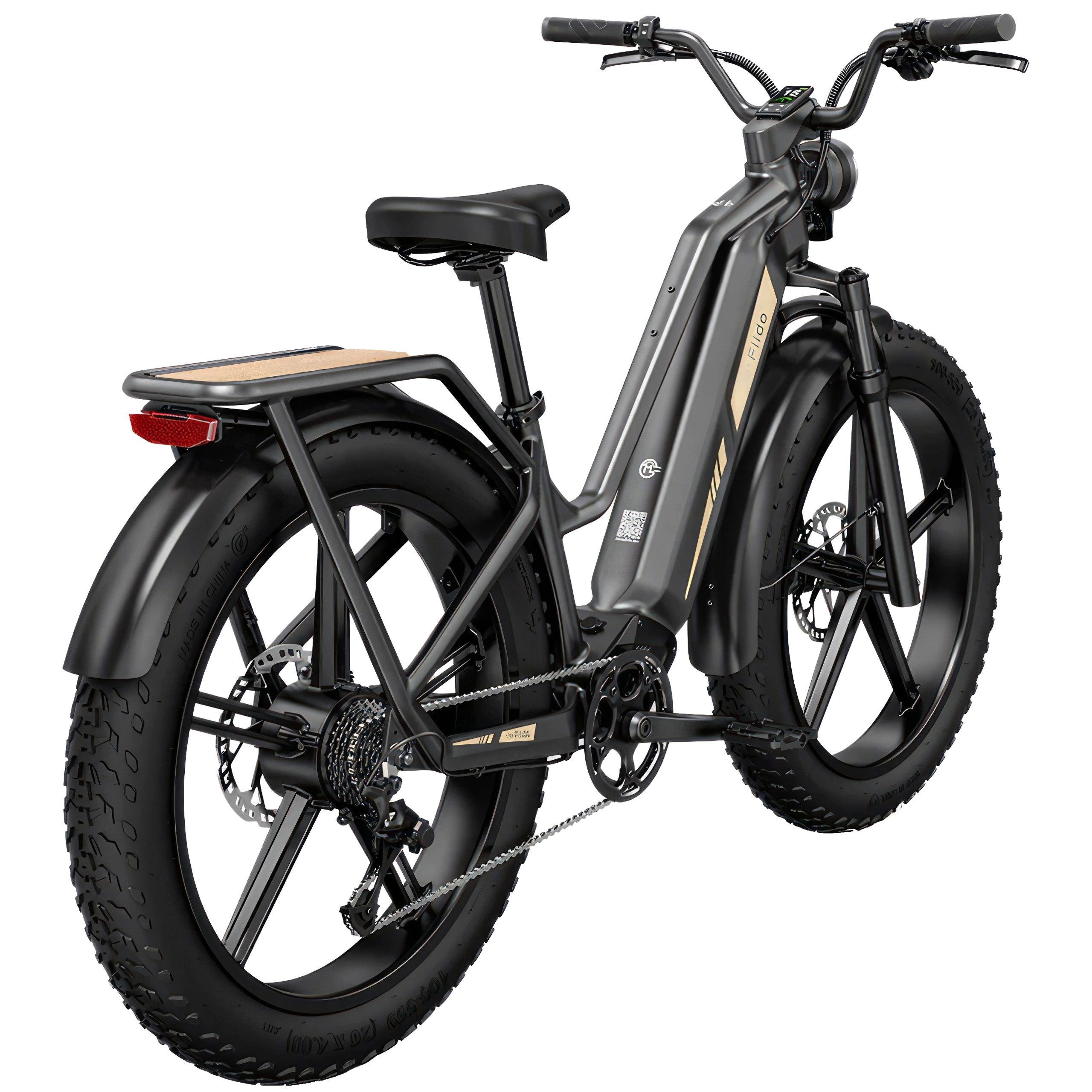 Fiido Titan kommer i en elegant matsort farve med store 26" hjul, der mener det alvorligt. De brede 4-tommers dæk og det solide sorte stel viser, at denne cykel er klar til alt. Bagagebæreren foran passer perfekt til det hårde look.