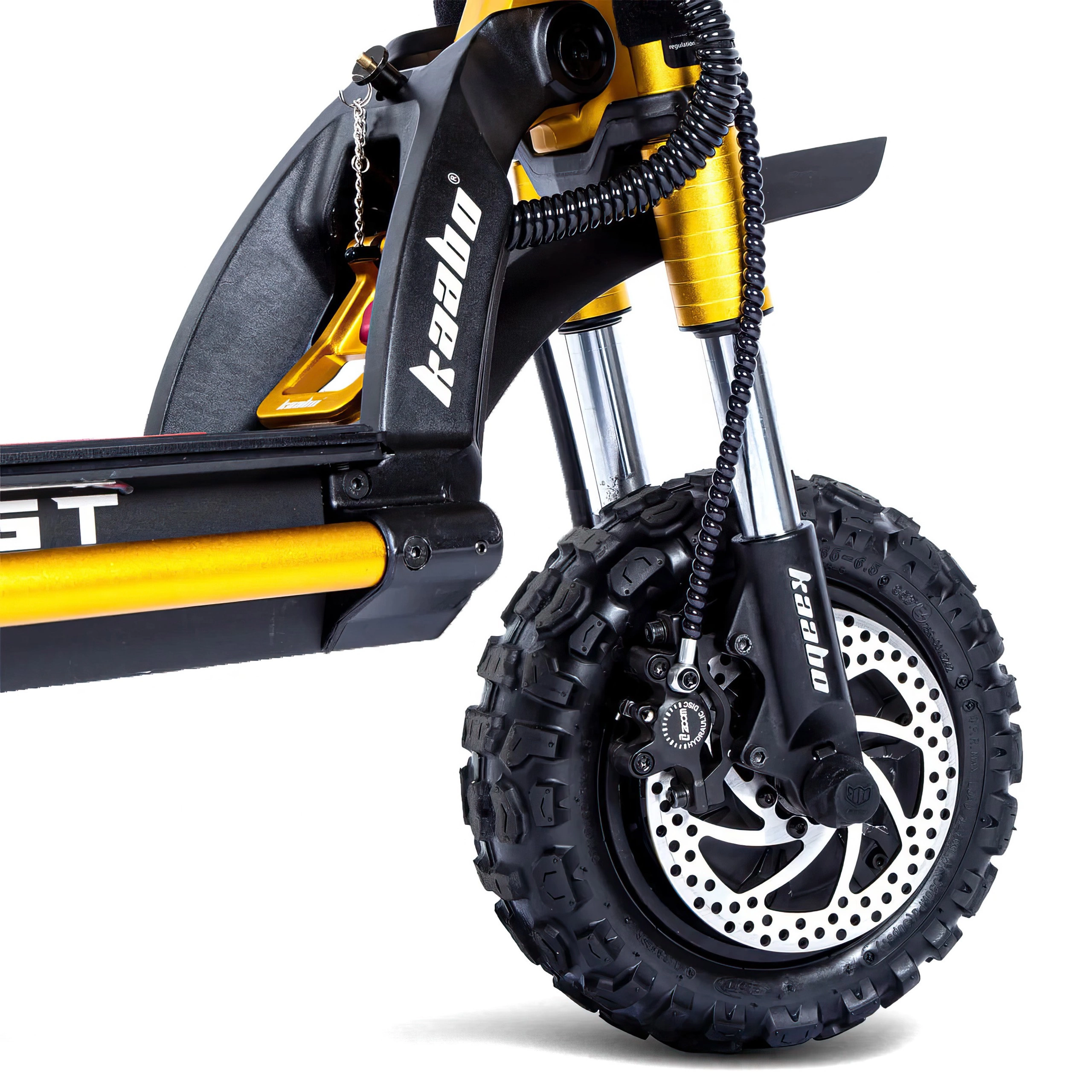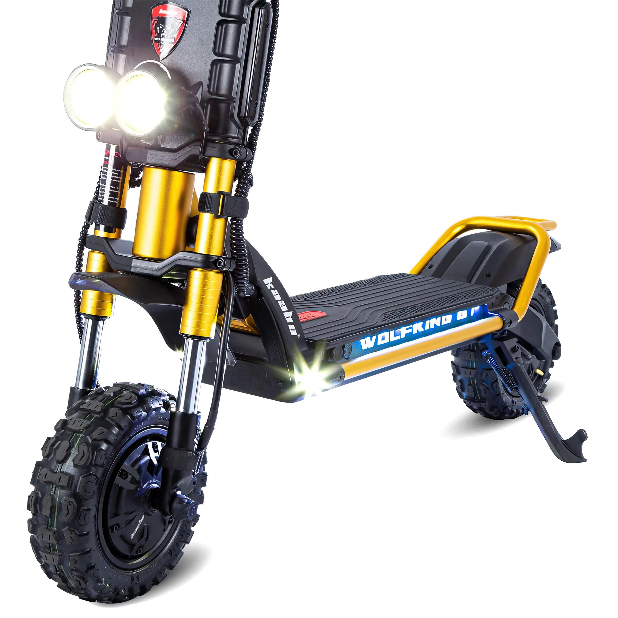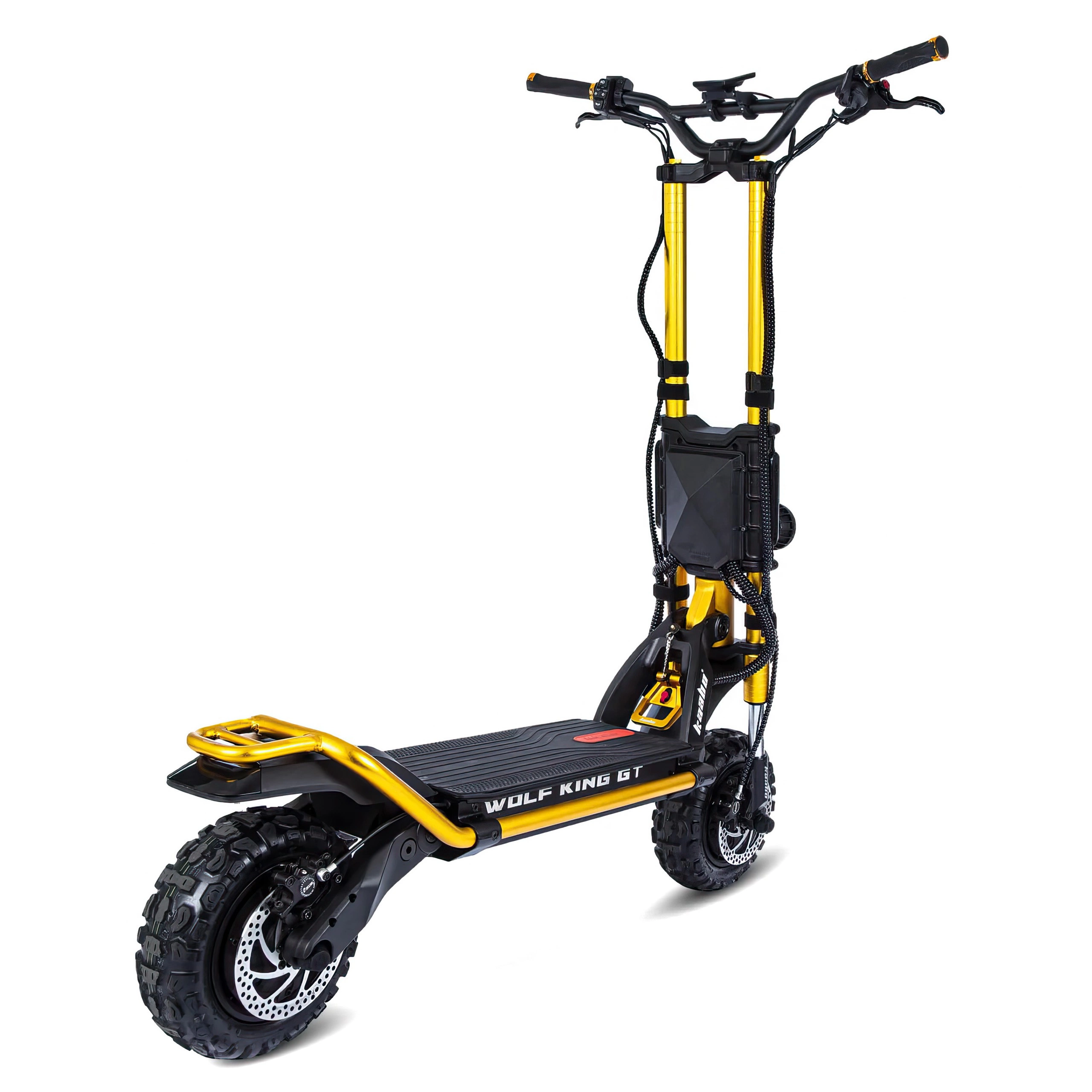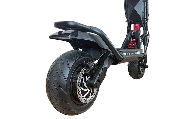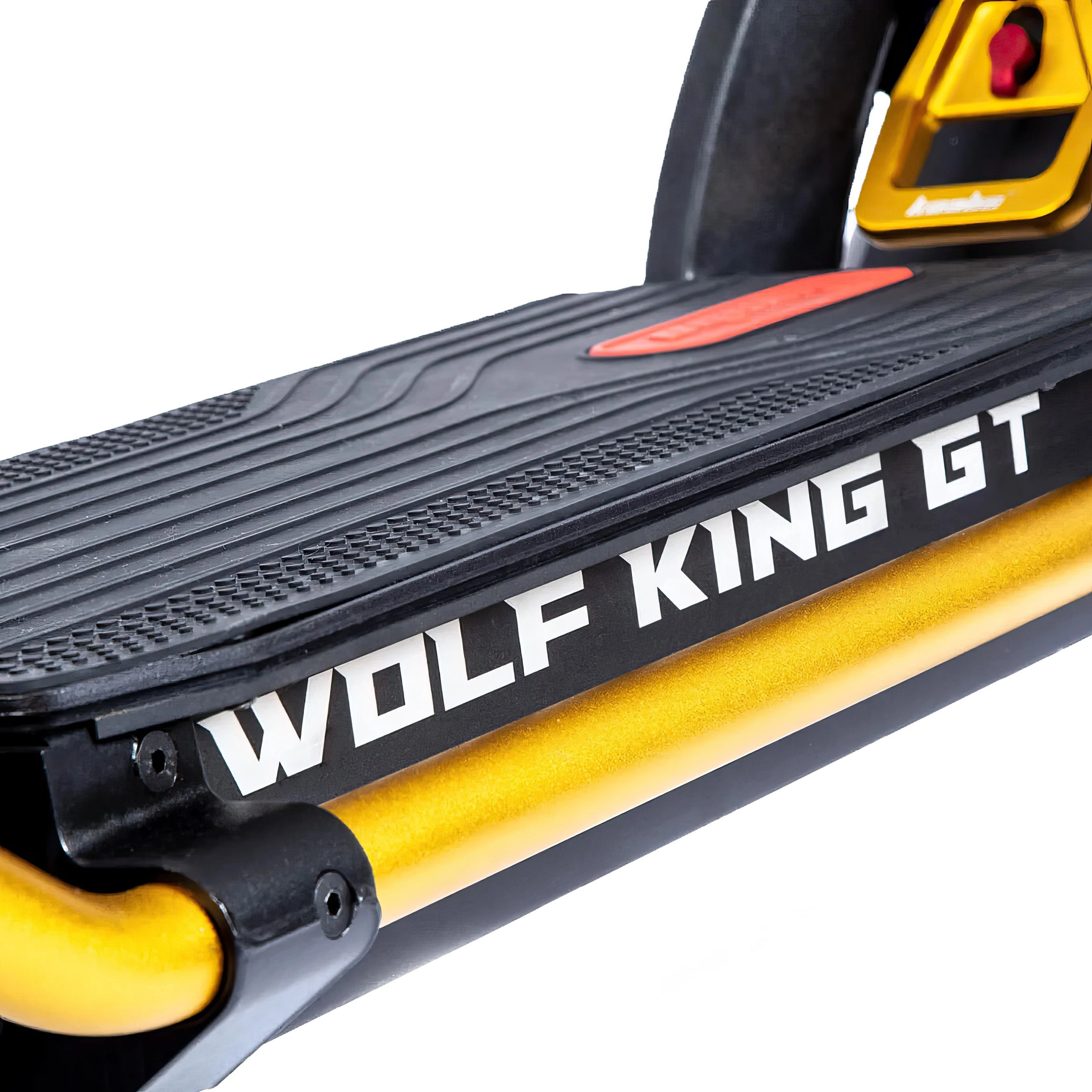 Plads er ikke et problem på Wolf King GT Pro. Den store platform giver dig mulighed for at stå behageligt, uden at du bliver træt, selv på længere ture. Med 8" frihøjde er der ingen bump, der bremser dig. elektrisk scooter tilbyder et strejf af personlighed med sine to karakteristiske farvemuligheder. For dem, der foretrækker et klassisk look, er den sorte og røde variant perfekt. Hvis du gerne vil skille dig ud, er den gyldne variant en showstopper, der giver din bil et unikt flair.