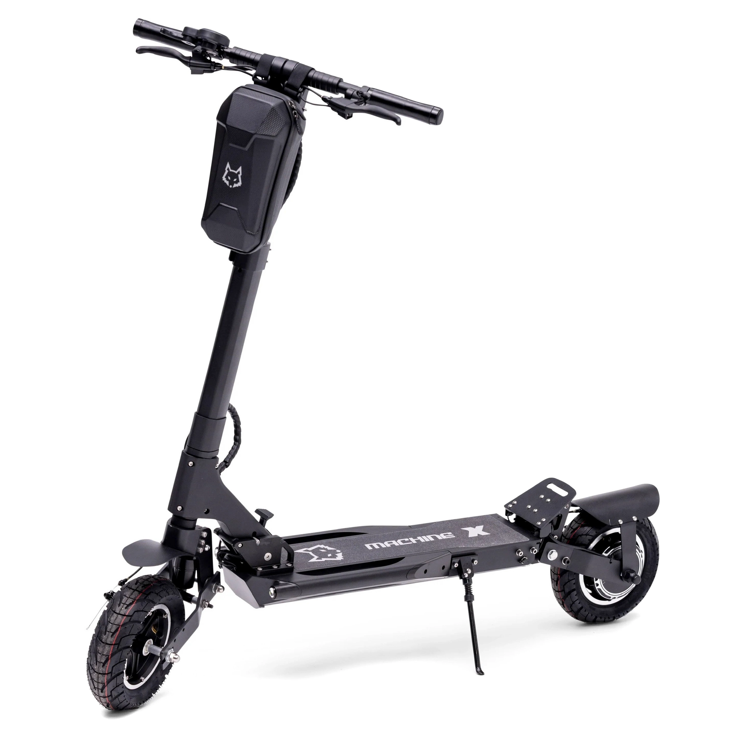 udforsk Machine X Transporter elektrisk elektrisk scooter's 1800W spidseffektmotor, der ubesværet kan rumme op til 150 kg (330 lbs). Den sikrer en jævn kørsel med affjedring for og bag, samtidig med at den opfylder sikkerhedsstandarderne for biler med dobbelte skivebremser.