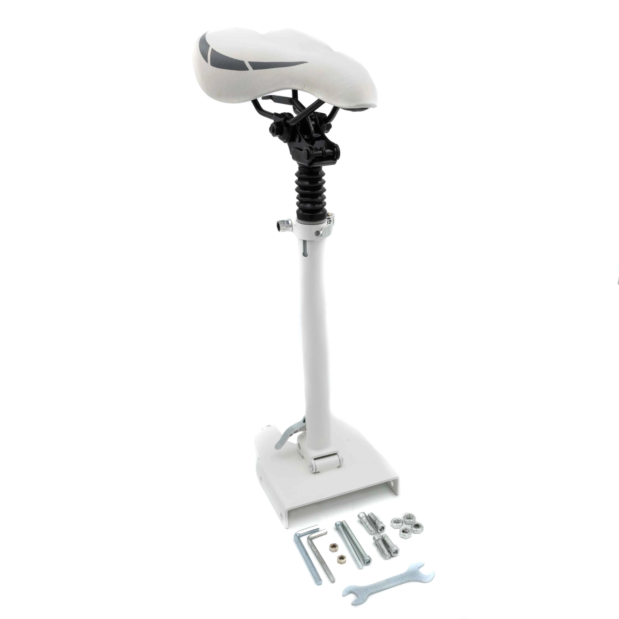 Det ekstra sæde er fastgjort til rammen på elektrisk scooter. Monteringen kan gøres på få minutter. Alt, hvad du behøver, er et grundlæggende sæt værktøj. Hvis du bliver træt af sædet efter et stykke tid, kan du derfor få elektrisk scooter til at se ud som før.